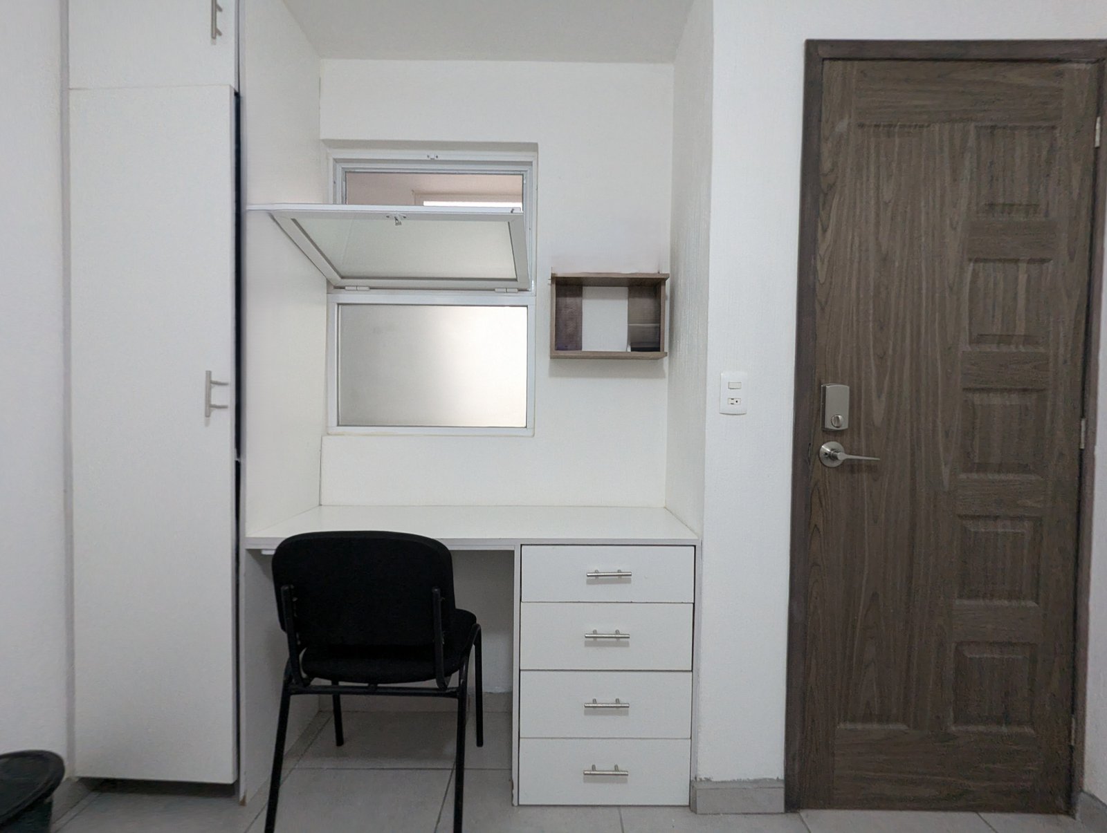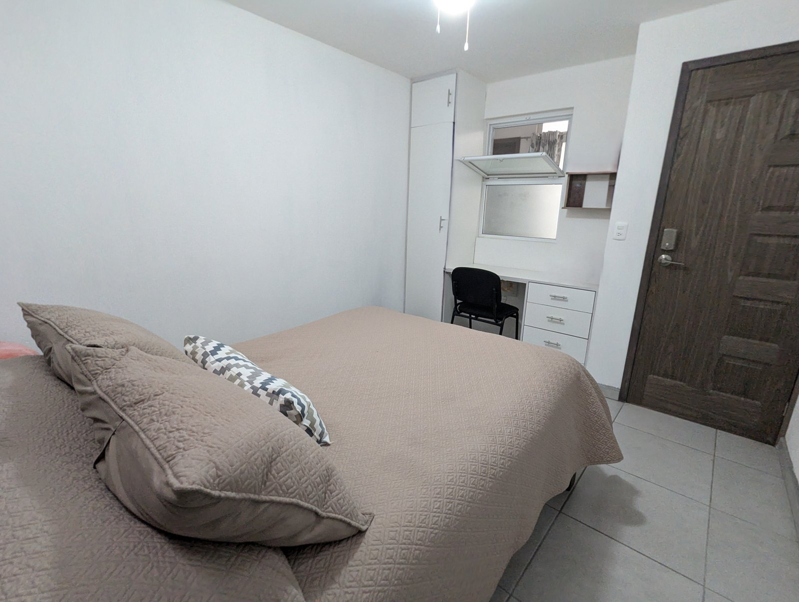 Acceso a cocina y lavandería compartida. Baño propio fuera de la habitación. Cama matrimonial, armario y escritorio.